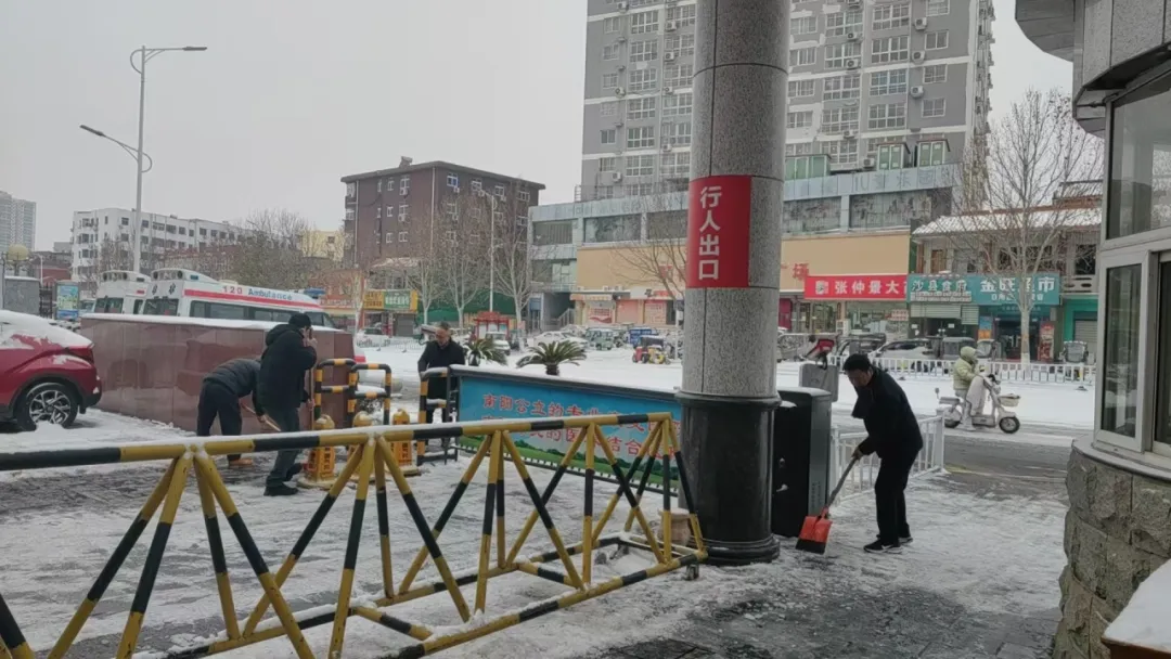 经过近一小时奋战,院内主干道及门口积雪被清理干净,为患者和家属开辟出畅通之路。同时在关键区域铺设了防滑垫,进一步保障了通行安全。