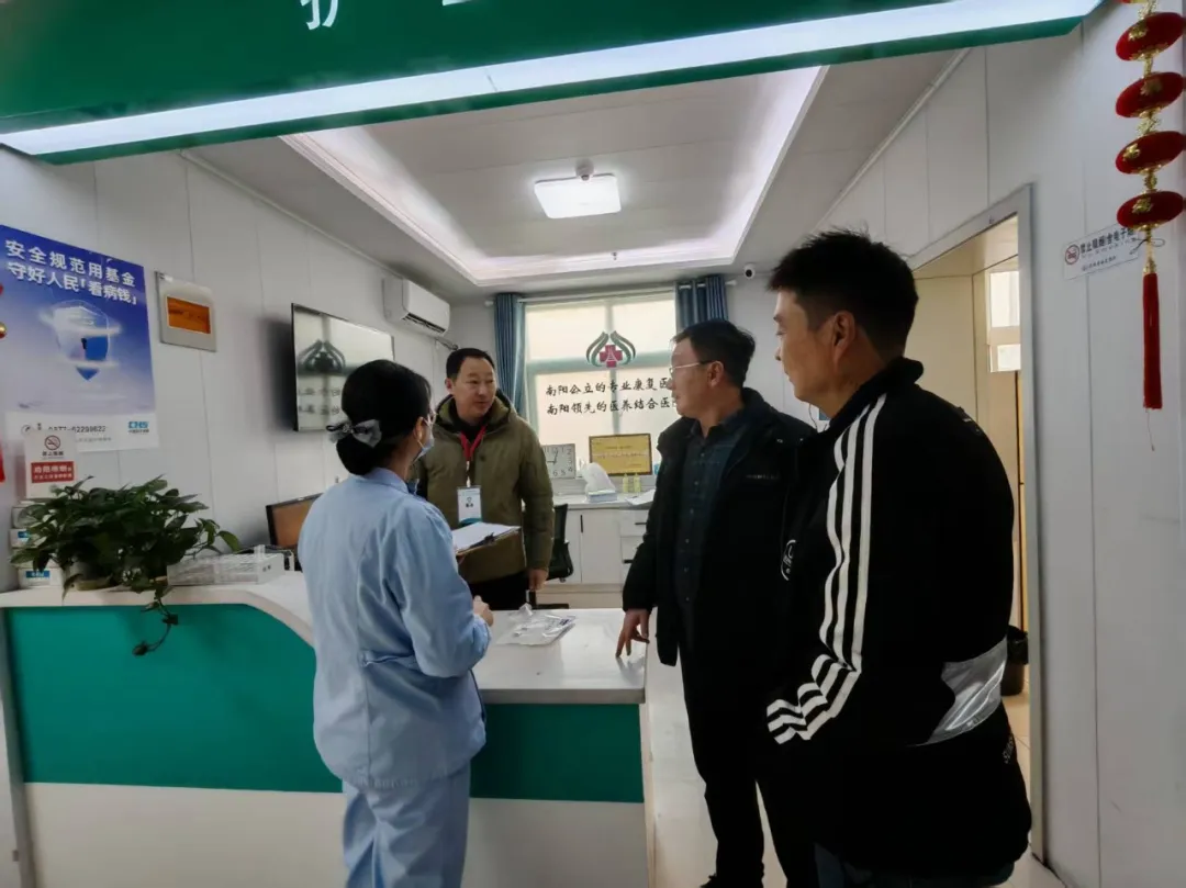 安全生产|南阳市康复医院开展元旦节前安全生产大检查发表时间:2025-12-30 15:53 元旦临近,为做好节假日期间安全生产工作,有效防范和遏制各类安全事件发生,确保医院各项工作安全稳定进行。12月30日,南阳市康复医院开展元旦节前安全生产大检查。上午,南阳市康复医院副院长崔晓、副院长朱志涛分别带队,深入医院各个关键区域,对全院的安全生产和医疗安全进行全方位拉网式的排查和督导。 崔晓副院长率队重点检查安全生产方面,对医院设备运行、氧气供应、消防设施、信息安全和食品安全等方面进行全面检查。重点查看了消防四级网格化管理落实情况、一键报警装置的响应速度等,确保各项消防保障措施到位、运行可靠。